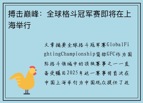本文将详细阐述“格斗巨星争锋全场热血沸腾 赛事激烈对决引发全球关注”这一话题。通过对格斗赛事的激烈对决、各大格斗巨星的出色表现、赛事背后的全球影响力以及格斗行业未来发展的展望,深入分析这一话题带来的巨大影响。赛事不仅展示了顶级格斗选手的实力,也展现了这一体育项目对全球观众的吸引力。本文将从四个方面来展开分析,以帮助读者更好地理解格斗巨星们的争锋如何引发全场热血沸腾,最终引起全球的广泛关注。1、格斗...