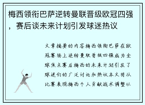 梅西,作为世界足坛历史上的伟大球员之一,凭借其卓越的个人技术和不断超越自我的精神,一直以来都以打破各种纪录、引领球队走向辉煌为目标。在他的职业生涯中,梅西无数次为球迷们带来了惊艳的表现,尤其是在打破个人纪录并助力球队夺冠方面,更是成就了无数的传奇。本文将从四个方面详细探讨梅西如何通过打破纪录助力球队夺冠,开启了其职业生涯的新篇章。首先,我们将回顾梅西的个人纪录破纪录历程,接着分析梅西的团队领导力以...